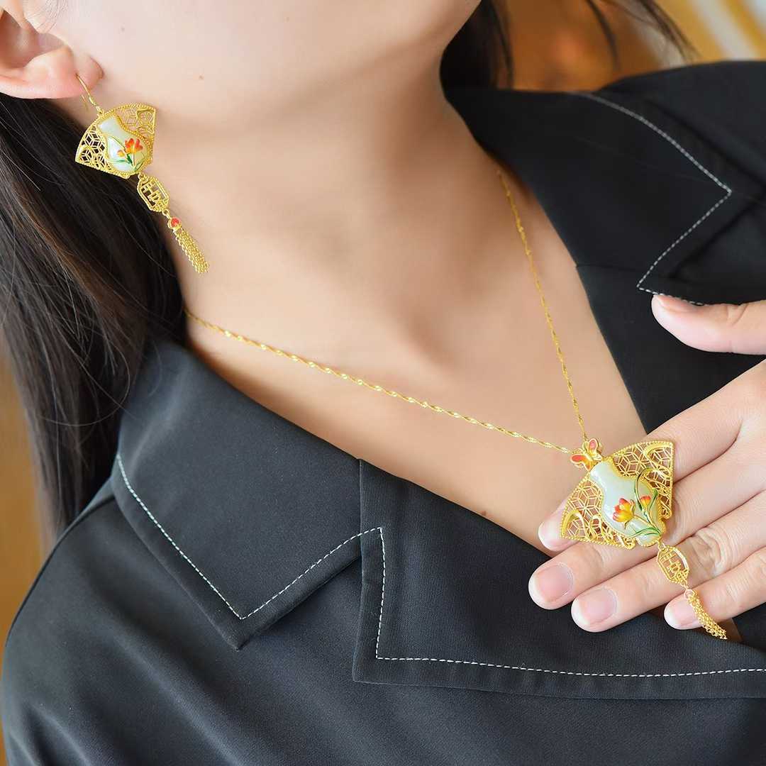 This elegant vintage-style jewelry set is crafted from traditional vintage silver and premium white Hetian nephrite, centered on the classic "Peace Vase" motif with delicate tassels. The set includes a pendant and a pair of earrings: the pendant features a small white Hetian nephrite "peace vase" (securely inlaid in a vintage silver frame), with a long silver tassel hanging below (adorned with tiny silver beads); the earrings mirror the pendant’ s design, with mini "peace vases" and short tassels for a balanced look. The vintage silver has a soft matte finish, exuding an antique charm that complements the jade’s creamy luster. The pendant comes with an adjustable vintage silver chain for comfortable wear. The set carries blessings of "peace and prosperity," making it a perfect gift for Lunar New Year, weddings, or family gatherings. It also suits daily wear with traditional clothing (cheongsams) or elegant casual outfits, merging oriental cultural heritage with timeless style.