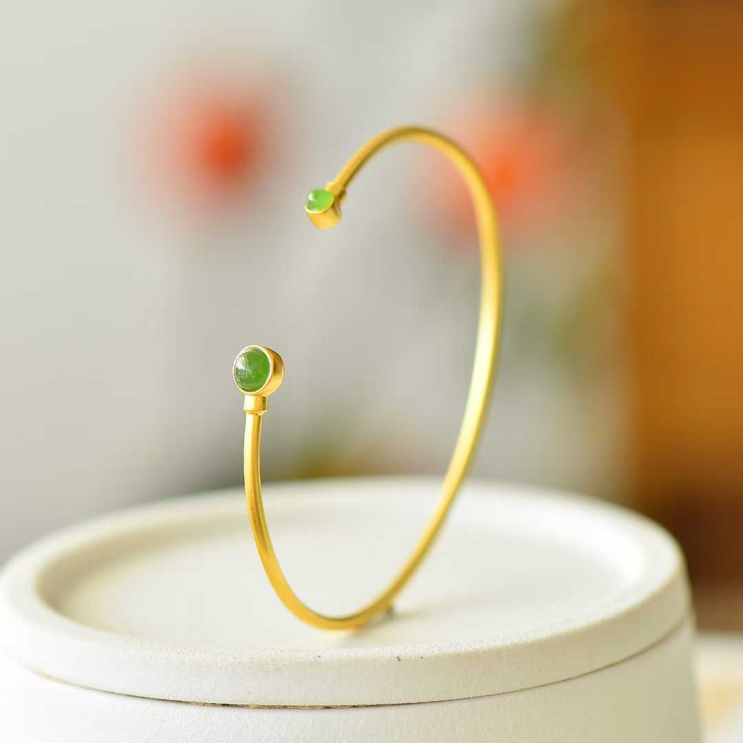 This luxurious and timeless bracelet blends rich color with refined craftsmanship, crafted from 925 sterling silver and premium Hetian jadeite (jasper) cabochons.Its core design integrates four harmonious elements—Hetian jadeite’s vivid green luster, cabochon’s smooth fullness, 925 silver’s durable elegance, and minimalist yet sophisticated styling—creating a piece that balances luxury with daily practicality.