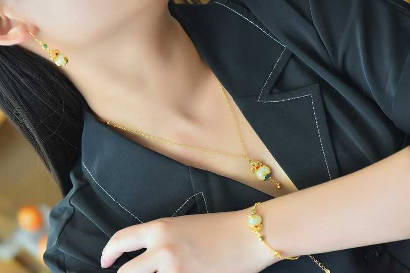 This elegant jewelry set features S925 silver inlaid with smooth nephrite, showcasing the Chinese auspicious motif "Fuyun Lianlian" (continuous good fortune). It's not just a collection of accessories, but a token of blessing for a life filled with prosperity and happiness.