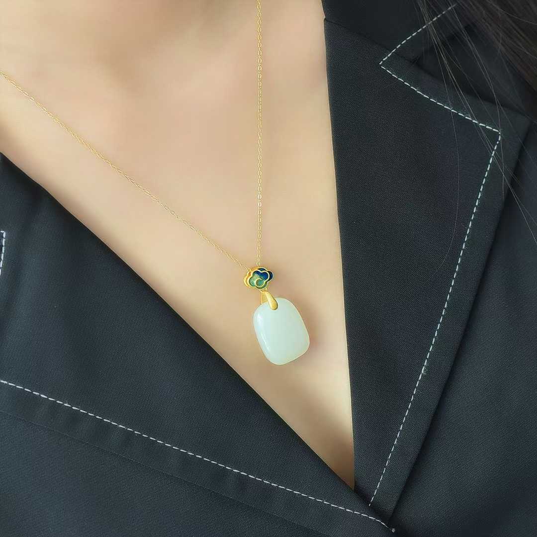925 Silver-Inlaid Hetian Jade Enamel Pendant with "Ping'an Pai" (Peace Plaque) & "Ruyi" Design The jade has a delicate texture, and features an innovative and elegant design.