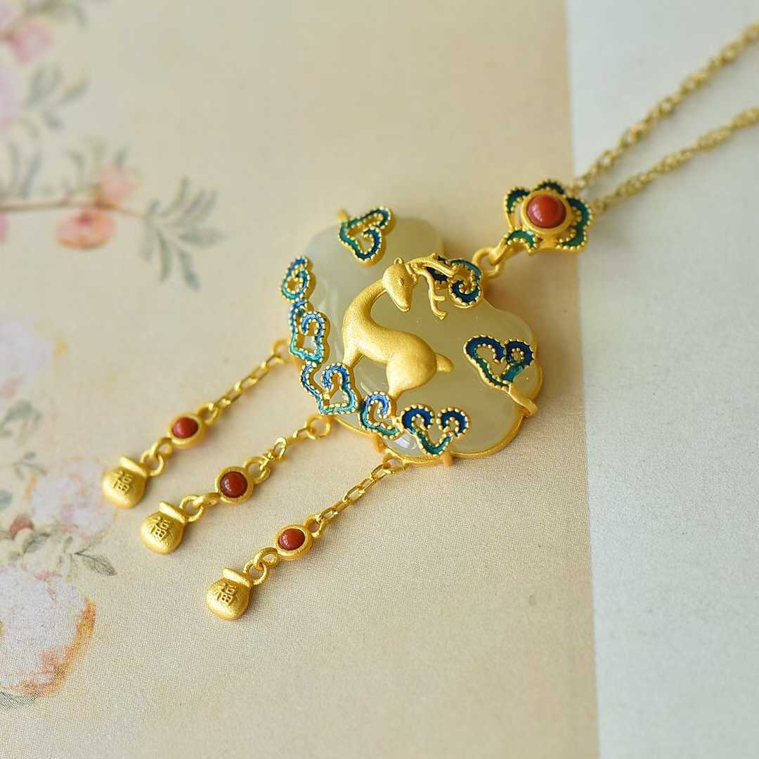Ancient-Style Silver-Inlaid Hetian Jade Enamel Pendant with "Deer (Bringing You Good Fortune)", "Ruyi" & "Lucky Lock" Designs