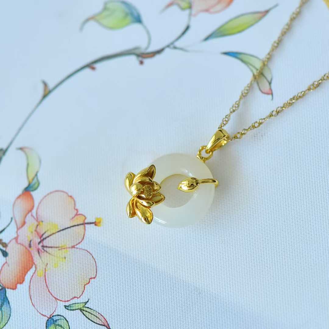 This serene pendant merges two iconic symbols of tranquility and auspiciousness, crafted from 925 sterling silver and inlaid with premium Hetian nephrite.Its design centers on a harmonious combination: a peace ring (a circular motif representing wholeness and safety) and a lotus (a universal symbol of purity and resilience, rising from water to bloom). The smooth Hetian nephrite cabochon—typically in soft white or pale celadon, with a creamy, translucent luster—forms the core of the peace ring or adorns the lotus petals, creating a gentle contrast with the polished silver.