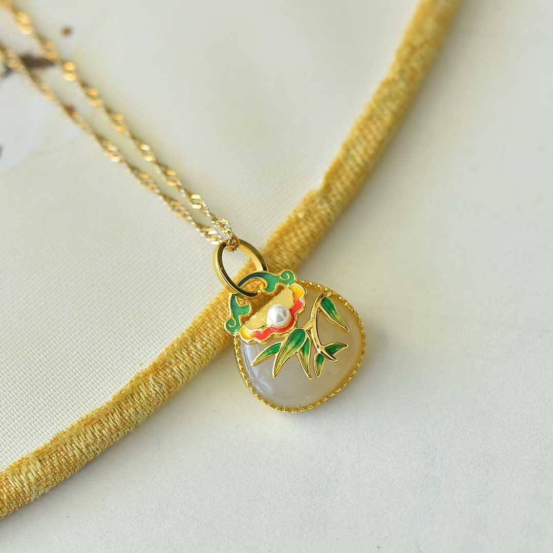 925 Silver Inlaid Nephrite "Bamboo Reports Safety" Bag Charm