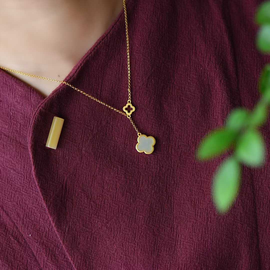 This delicate pendant is made of 925 silver, inlaid with smooth Nephrite, and shaped like a four-leaf clover—a timeless symbol of good luck. It’s perfect for daily wear or as a meaningful gift.