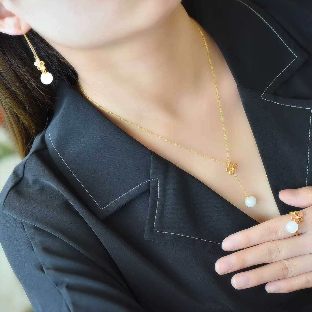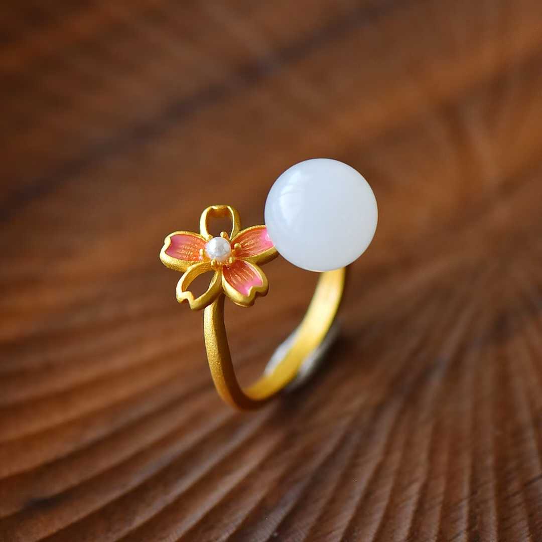 The rich gilt luster exudes a classic and luxurious quality. The delicate enamel blend creates vibrant and delicate florals, paired with the soft, translucent white jade beads for a refined and lively look. Whether worn as a necklace draped around the neck or as a ring gently worn on the fingertip, it embodies the vibrant beauty of spring blossoms and the elegant charm of jade. A simple dress and sweater combination perfectly complements your outfit, adding a touch of vintage elegance to your look, adding a touch of classic style to your everyday wardrobe.