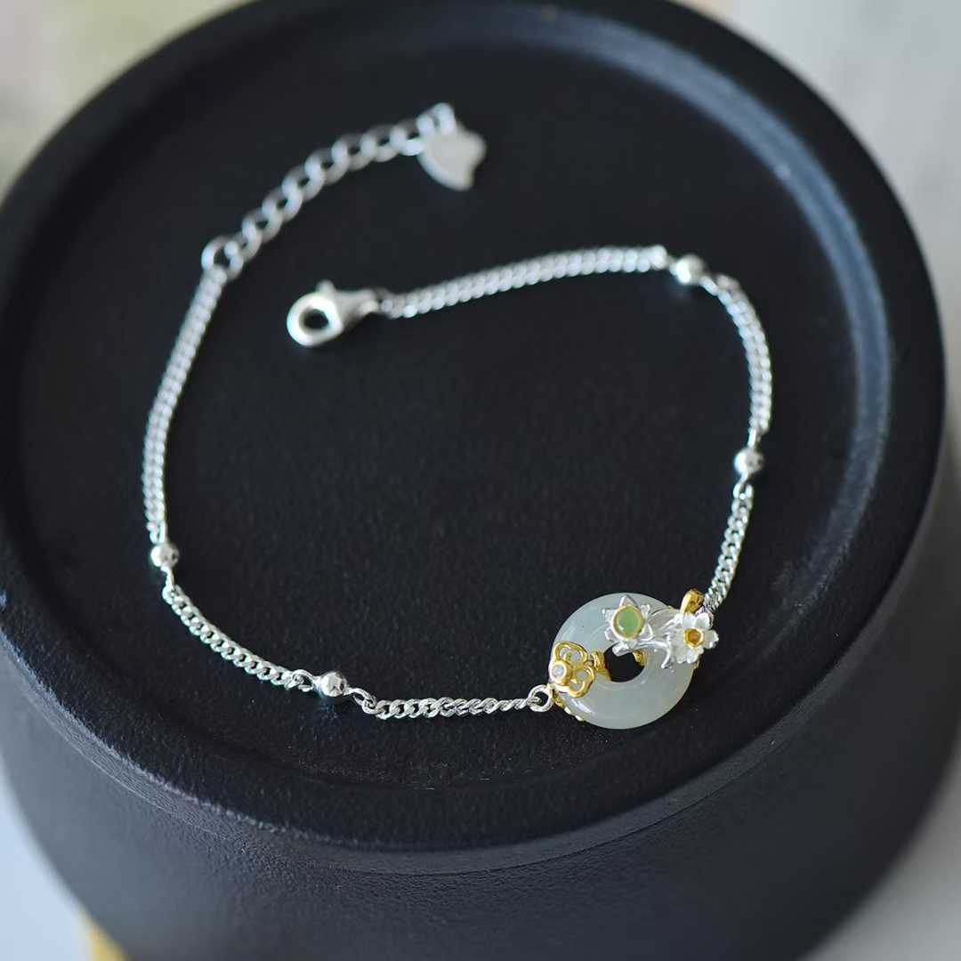 This elegant and culturally resonant jewelry set merges traditional Chinese floral mythology with exquisite craftsmanship, crafted from 925 sterling silver and inlaid with premium Hetian nephrite.Its core design revolves around the "December Daffodil" motif—one of the "Twelve Flower Gods" in Chinese culture, where each month corresponds to a symbolic flower, and December is embodied by the daffodil (signifying purity, prosperity, and new beginnings). The set typically includes a pendant, bracelet, and earrings, creating a cohesive look that balances cultural depth with modern wearability.