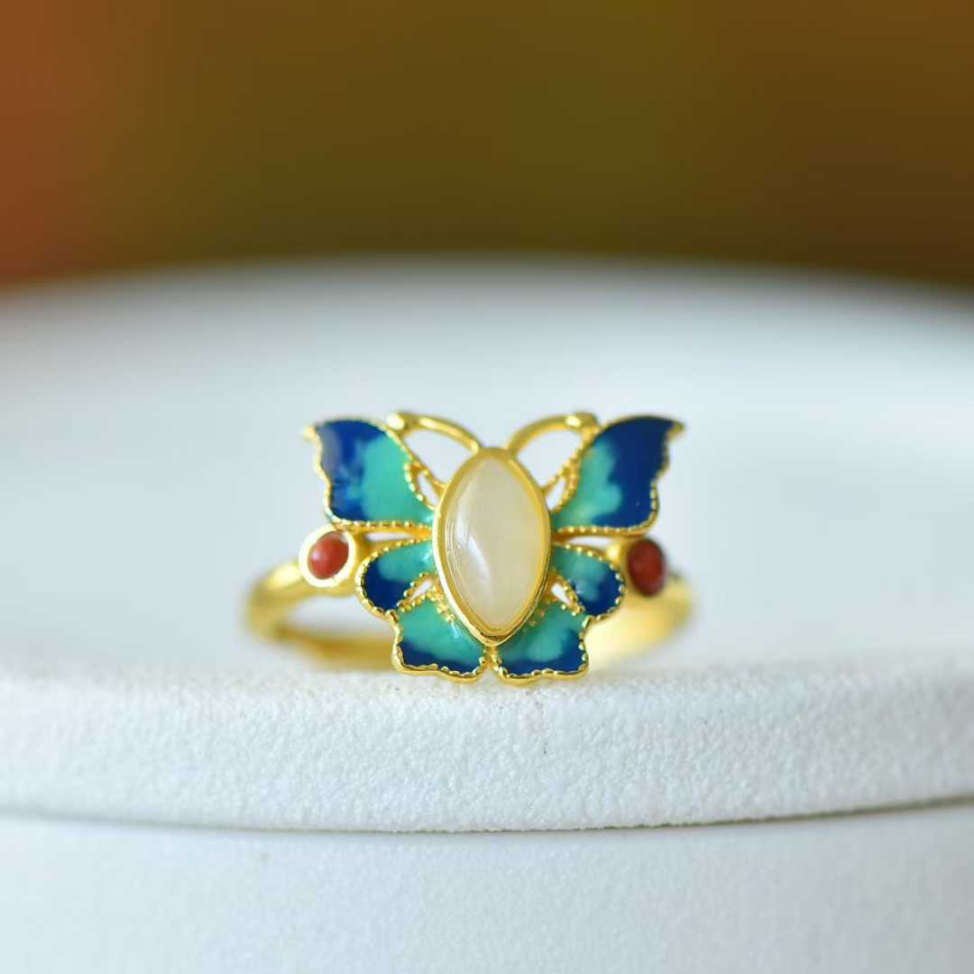 Vintage-Style Silver Inlaid Hetian Nephrite "Butterfly Dancing Gracefully" Jewelry Set