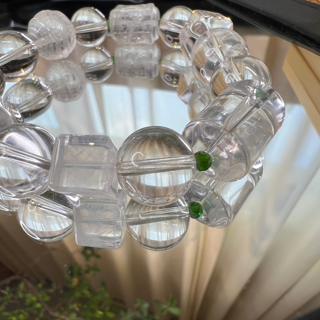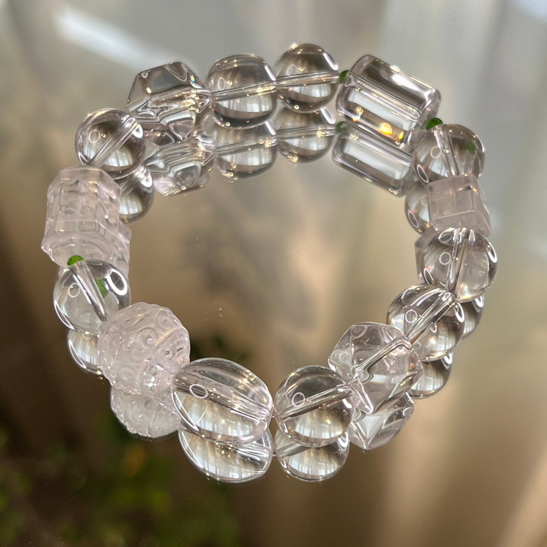 اكتشف سحر سوار الكريستال الأبيض متعدد الكنوز. هذه القطعة الرائعة هي سيمفونية من الجمال والأناقة، مصممة لتأسر حواسك.