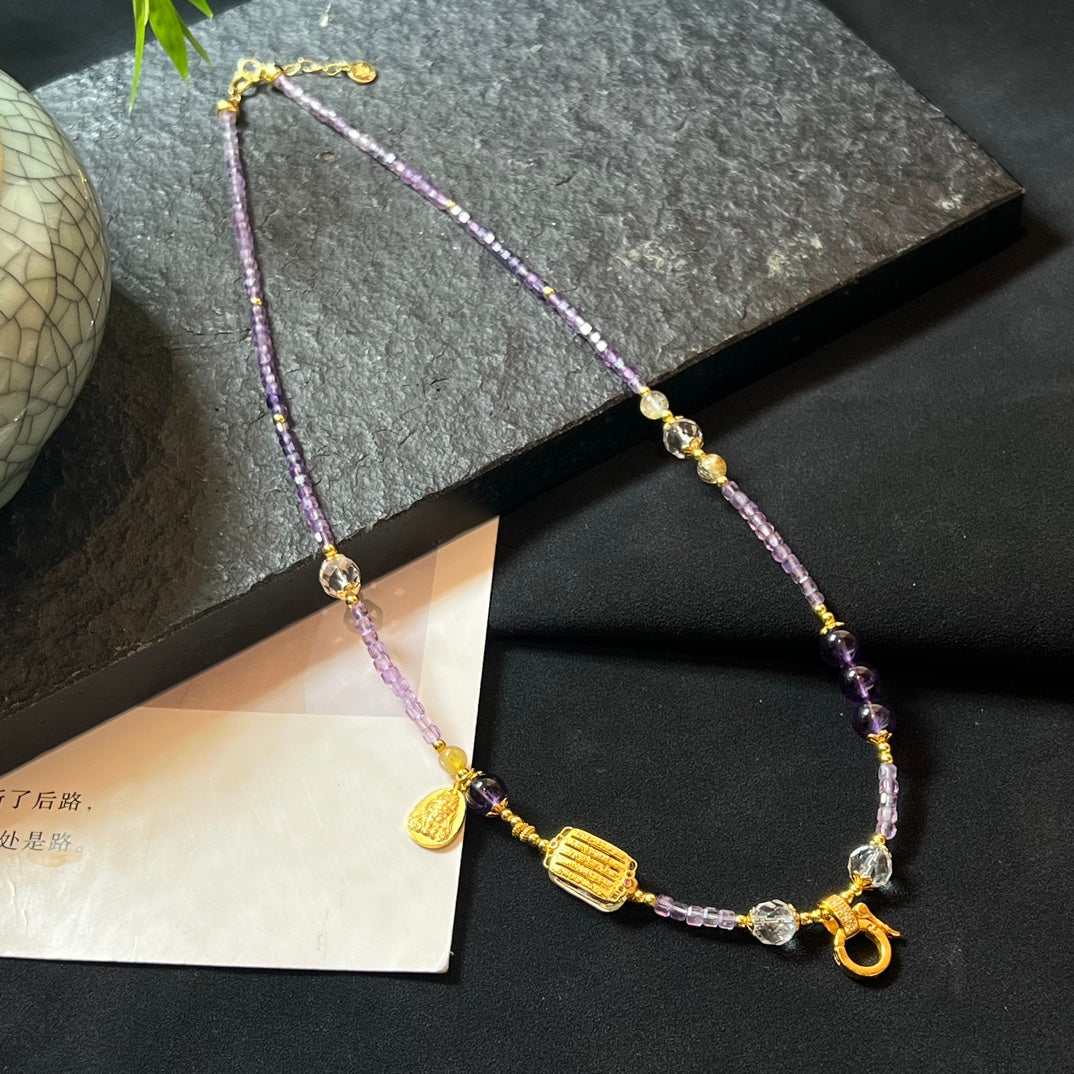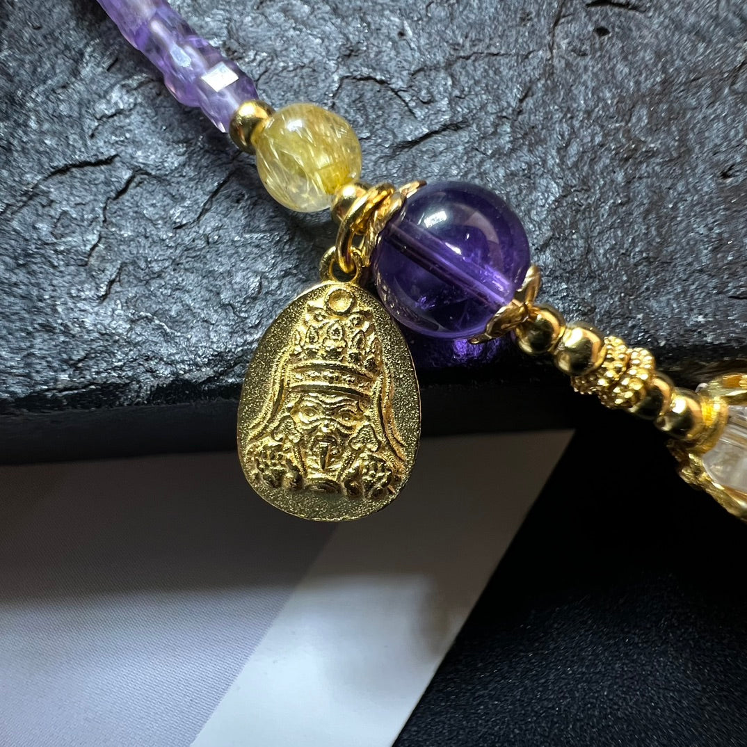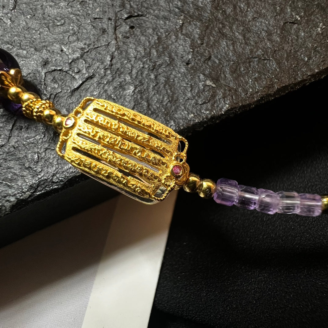 مواد المنتج: جمشت مربع ➕ جوانب كريستالية بيضاء ➕ كريستال روتيلات ذهبي ➕ حبات جمشت مستديرة ➕ قلادة زهاجيرام مطلية بالذهب ➕ إكسسوارات مطلية بالذهب من خمسة أسطر من النصوص المقدسة ➕ مشبك عالمي مطلي بالذهب