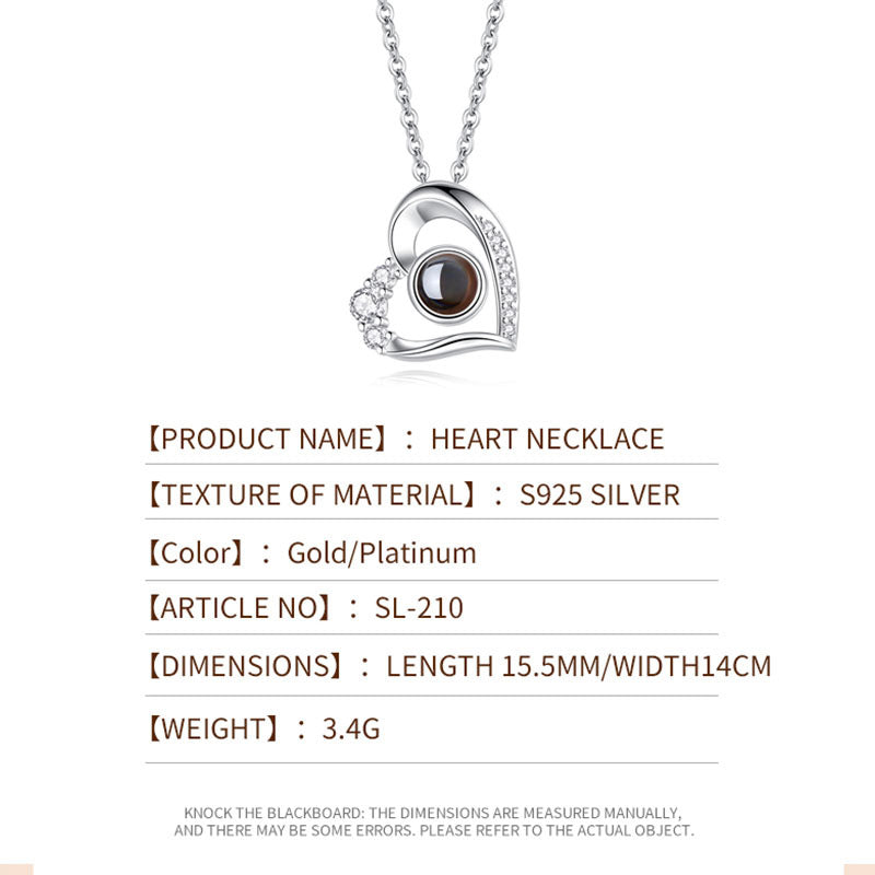 - El colgante en forma de corazón, un símbolo atemporal del amor, guarda un secreto en su interior. Gracias a su avanzada tecnología de proyección, puede mostrar una foto querida al iluminarse. Ya sea una foto de tu familia, un momento romántico con tu pareja o la foto de tu mascota, este collar te permite tener esos recuerdos preciados a mano, listos para ser revelados con una simple fuente de luz. La imagen está delicadamente grabada, lo que garantiza proyecciones nítidas y claras que capturan cada detalle.