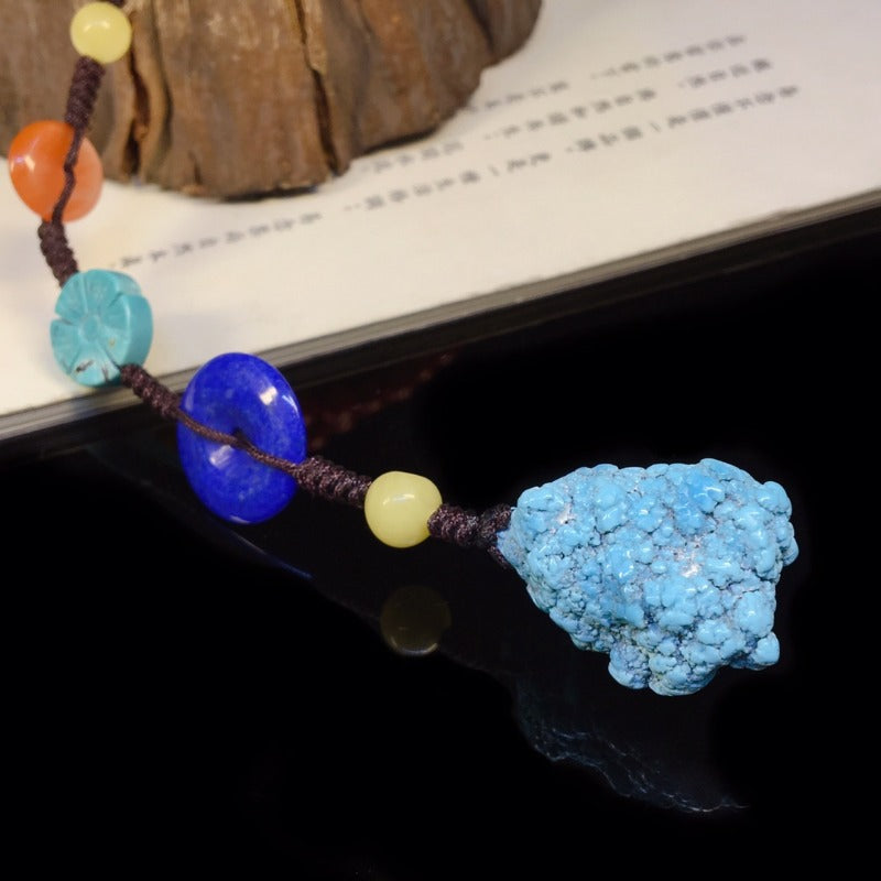[Material]: Cuentas redondas Nanhong naturales de grano completo y a todo color ➕ Cuentas redondas de tres vías de turquesa azul intenso de porcelana natural ➕ Flores de turquesa ➕ Cuentas redondas de cera de abejas natural ➕ Cuentas redondas finas Nanhong ➕ Hebilla de paz de lapislázuli ➕ Anillo de lapislázuli ➕ Colgante de turquesa de forma libre