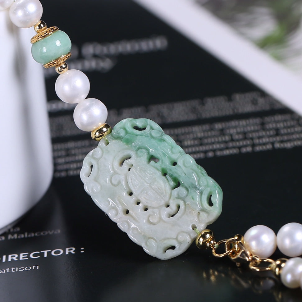 【Material】: Cuentas redondas de perla natural ➕ Cuentas redondas con incrustaciones de jade natural ➕ Placa de jade natural ➕ Jaspe con incrustaciones de plata pura, estilo elegante, múltiples formas de usar, admite pruebas