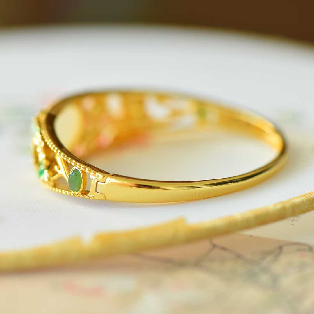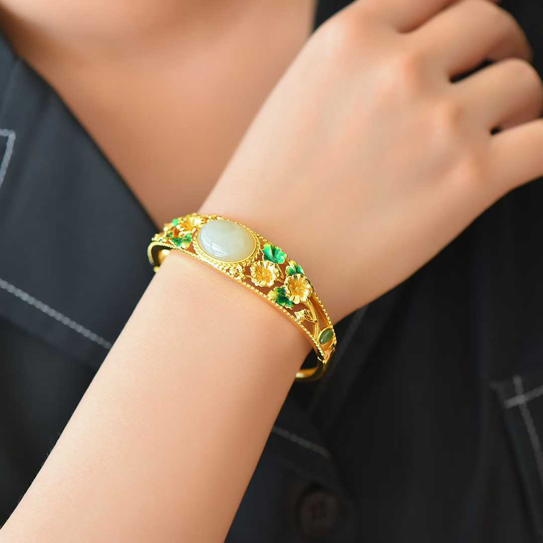 The bracelet body made of pure gold glows with a warm and dazzling luster, fully showing its luxurious nature. The exquisite hollow-out craftsmanship outlines lifelike blooming flowers and branches. Every line is delicate, as if telling the poetry of flowers in full bloom. The leaves decorated with enamel are vividly green, as if stained with morning dew, adding a lively vitality to the bracelet.