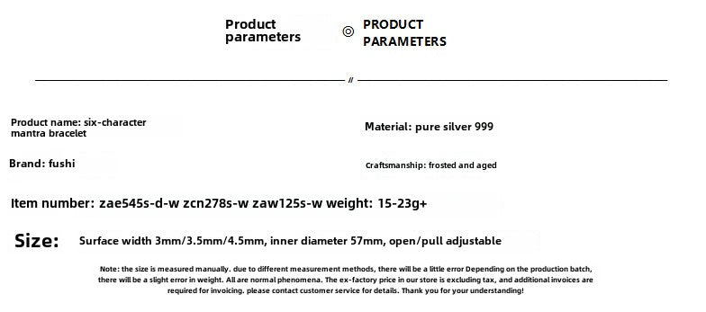 - This bracelet is crafted with meticulous care. The sterling silver shines with a soft luster, enhancing the beauty of the intricately engraved scriptures and the round sticks. In Chinese culture, scriptures are often regarded as sources of wisdom and inspiration, while the round sticks symbolize stability and strength.