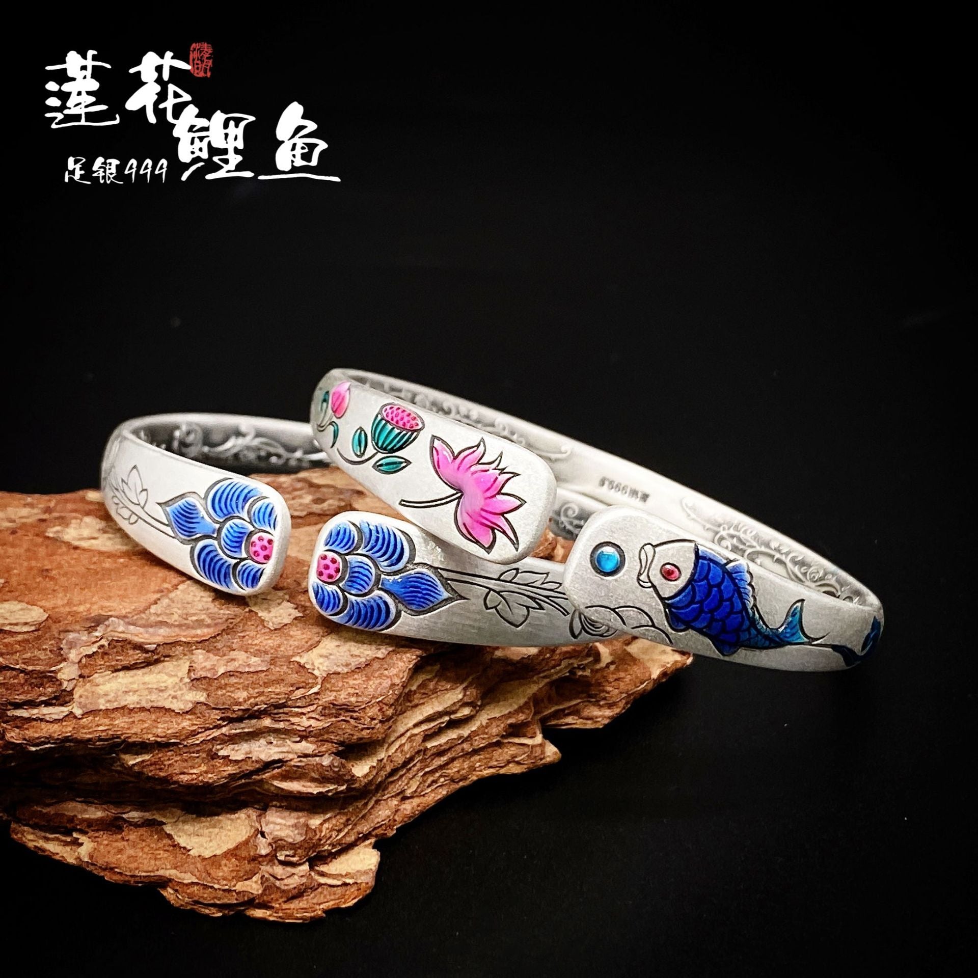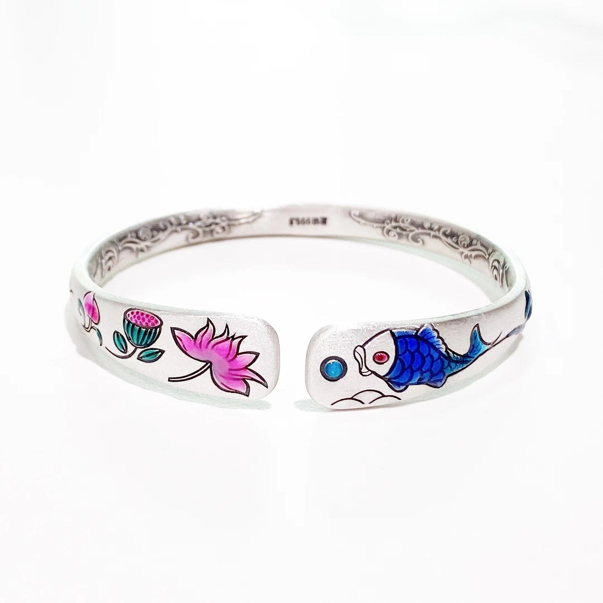 - This bracelet is a true work of art, fusing the elegance of sterling silver with the symbolic charm of lotus and carp. The sterling silver base shines with a soft luster, providing a luxurious backdrop for the intricate designs.