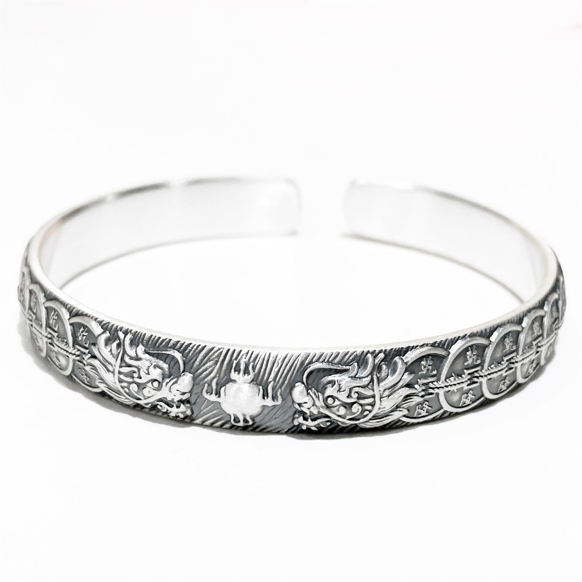 - This bracelet showcases two intricately detailed dragons, symbols of power, strength, and good fortune in Chinese culture. Crafted from sterling silver, it shines with a lustrous glow that catches the light at every turn. The dragons seem to come alive, their scales meticulously engraved and their expressions full of vitality.