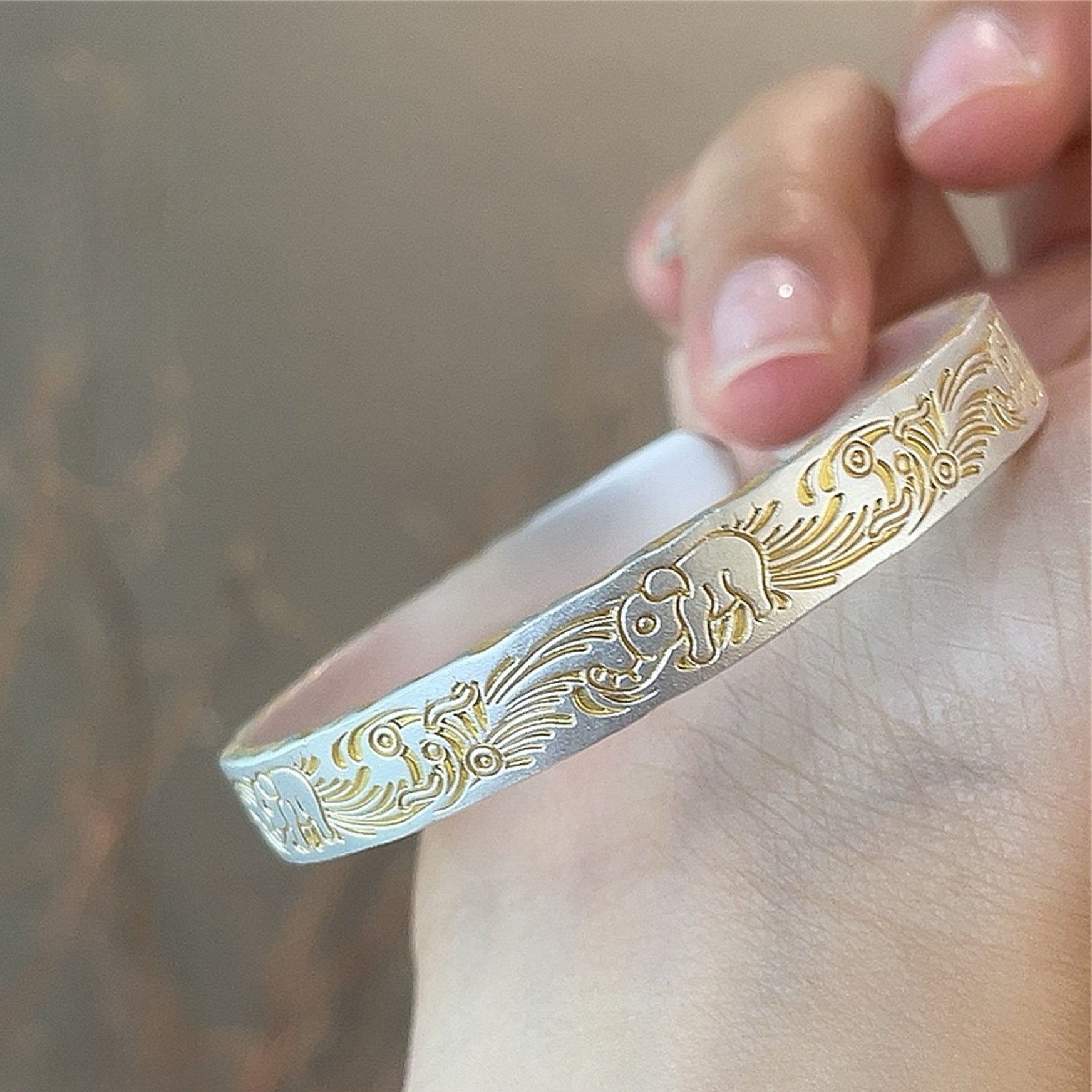 Solid bracelet with gold-painted lucky elephant and hammered pattern