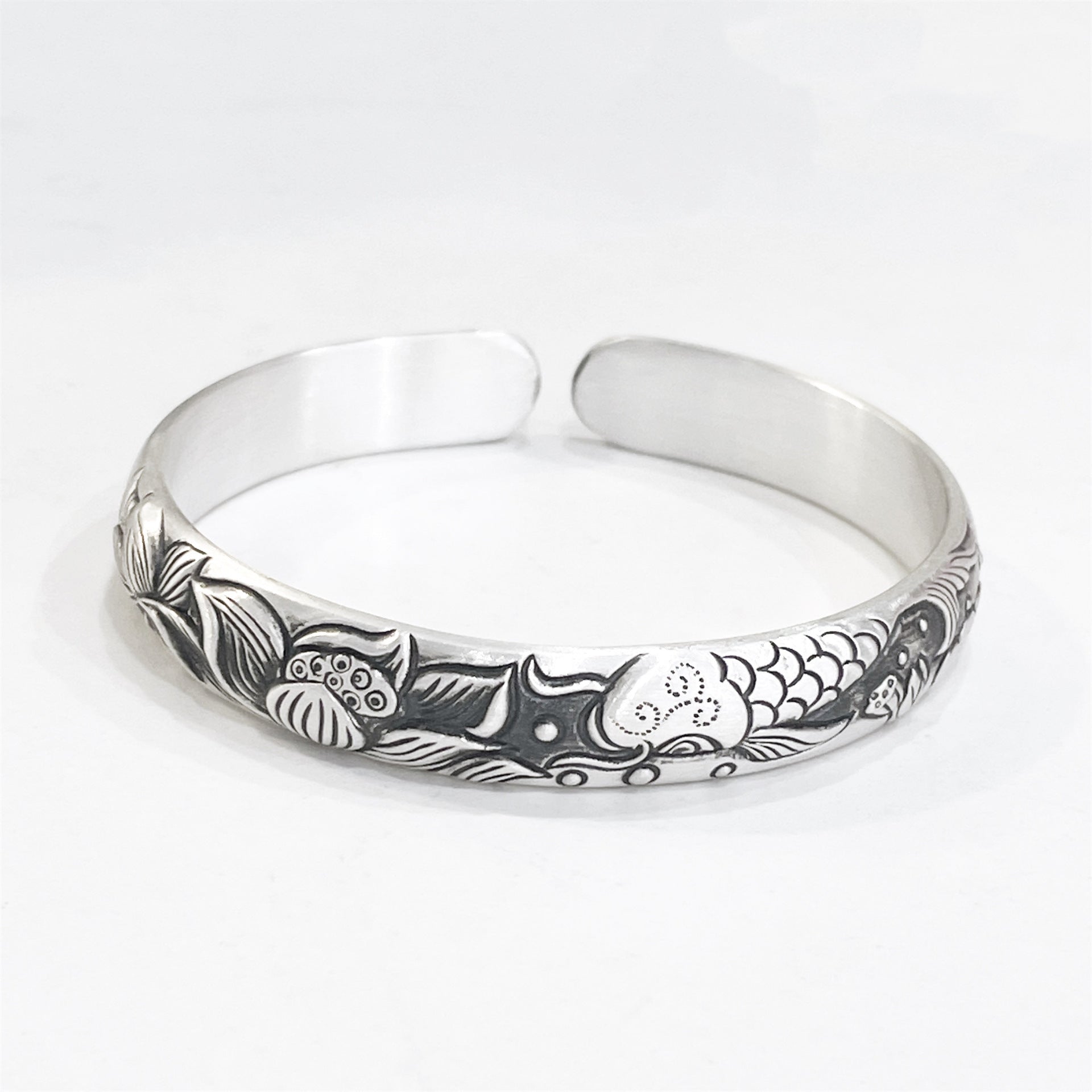 - Exquisite Chinese Style Relief Carp Sterling Silver Bracelet - A Symbol of Luck and Prosperity.