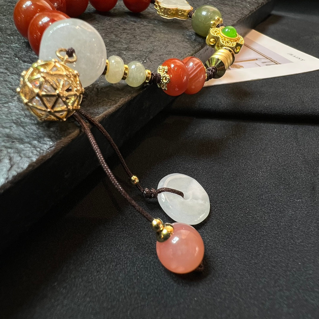 Product materials: Red agate (12mm)➕Hetian jade inlay➕Hetian jade old style➕Red agate spacer➕Emerald peace buckle