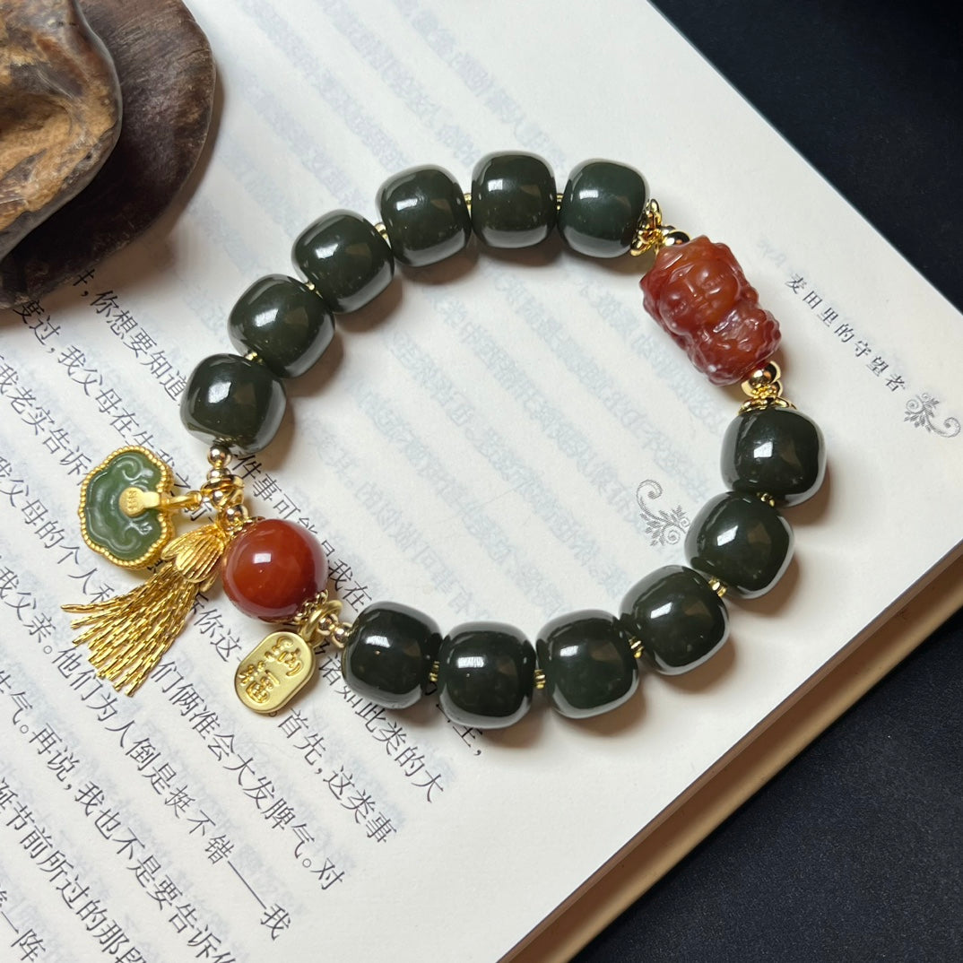 Crafted from the finest Hetian jade, known for its elegance and durability, this bracelet showcases the natural beauty of the stone. The soft, creamy hues and smooth texture of Hetian jade give it a timeless appeal that is sure to captivate.