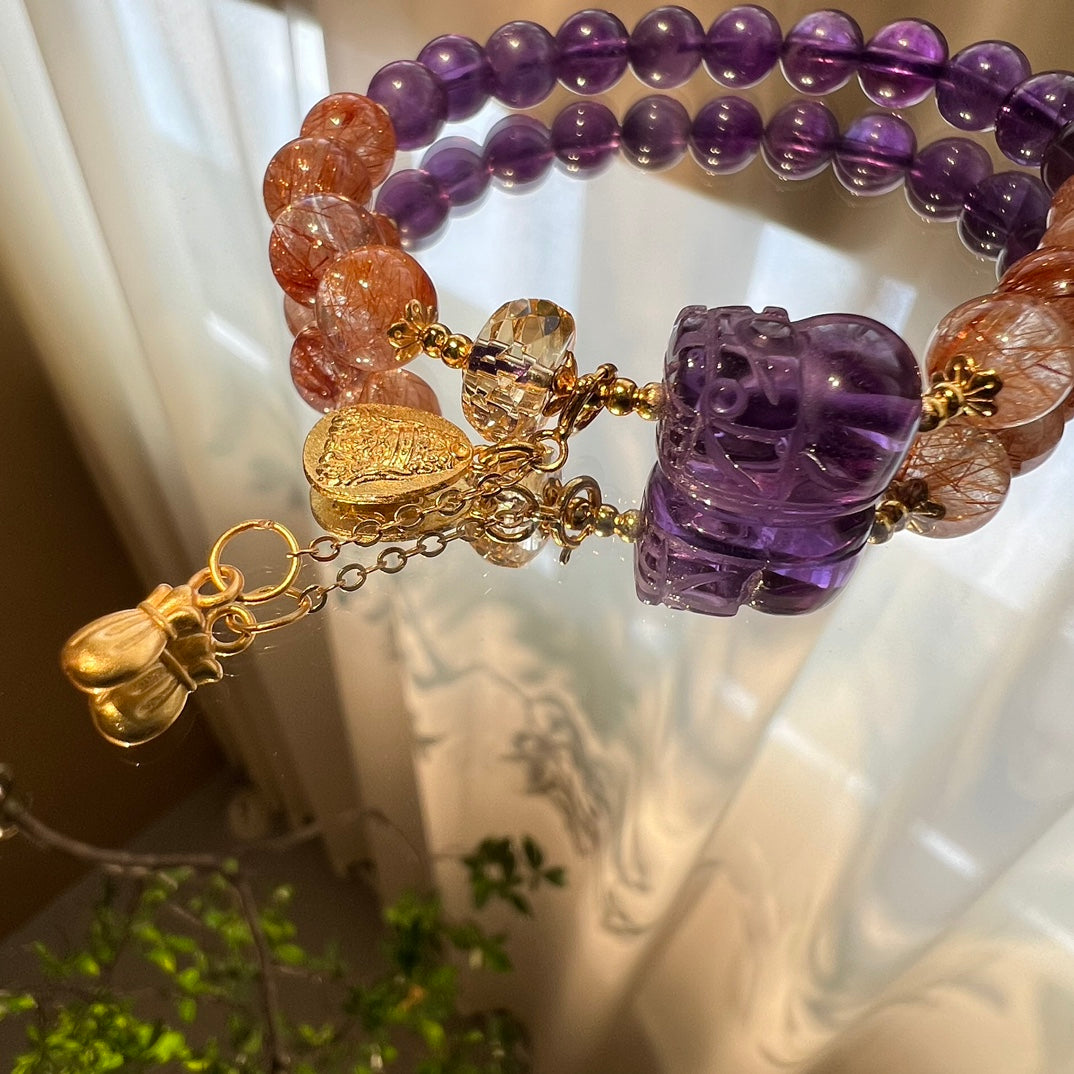Product materials: Amethyst Pixiu➕Amethyst round beads➕Red Rutilated Quartz➕Citrine faceted➕Silver-plated Zaki pendant➕Silver-plated money bag
