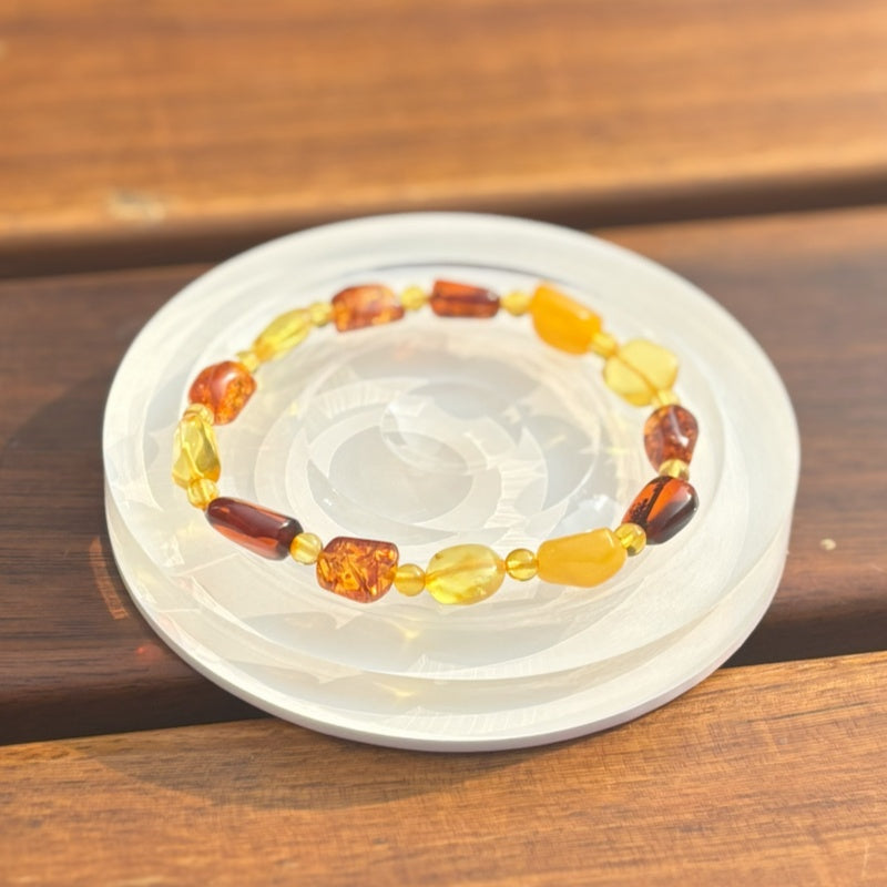 - This bracelet is made of high-quality Baltic amber beeswax, and each piece embodies the traces of time. Chanterelle yellow is rich and mellow, like a warm sun; The white honey is pure and immaculate, as holy as the first snow; The golden honey is ethereal, like a dreamy cloud. Coupled with the deep blue and green of turquoise, the bright and delicate red of southern red, and the mysterious blue of lapis lazuli, the color collision shows luxury and romance.