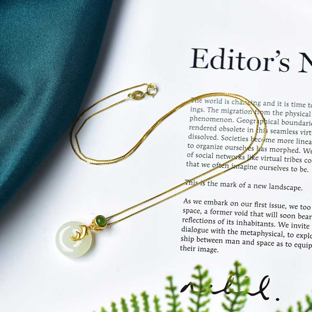This charming and auspicious pendant blends marine vitality with traditional blessings, crafted from 925 sterling silver and set with premium Hetian nephrite.Its core design integrates two harmonious elements—dolphin motif (a universal symbol of freedom, joy, and good fortune) and Peace Buckle (a classic Chinese symbol of safety, harmony, and life’s completeness)—creating a piece that balances playful charm with cultural depth.