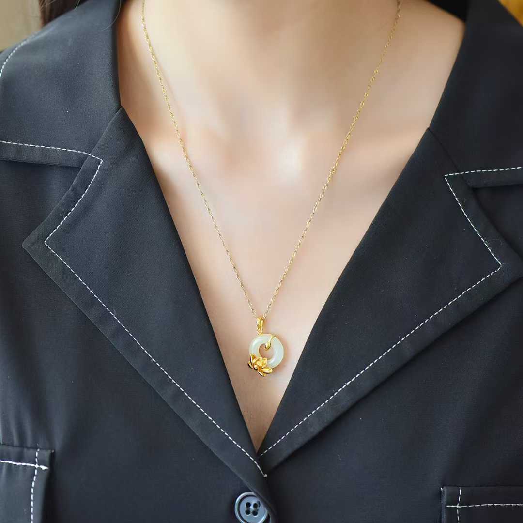 This serene pendant merges two iconic symbols of tranquility and auspiciousness, crafted from 925 sterling silver and inlaid with premium Hetian nephrite.Its design centers on a harmonious combination: a peace ring (a circular motif representing wholeness and safety) and a lotus (a universal symbol of purity and resilience, rising from water to bloom). The smooth Hetian nephrite cabochon—typically in soft white or pale celadon, with a creamy, translucent luster—forms the core of the peace ring or adorns the lotus petals, creating a gentle contrast with the polished silver.