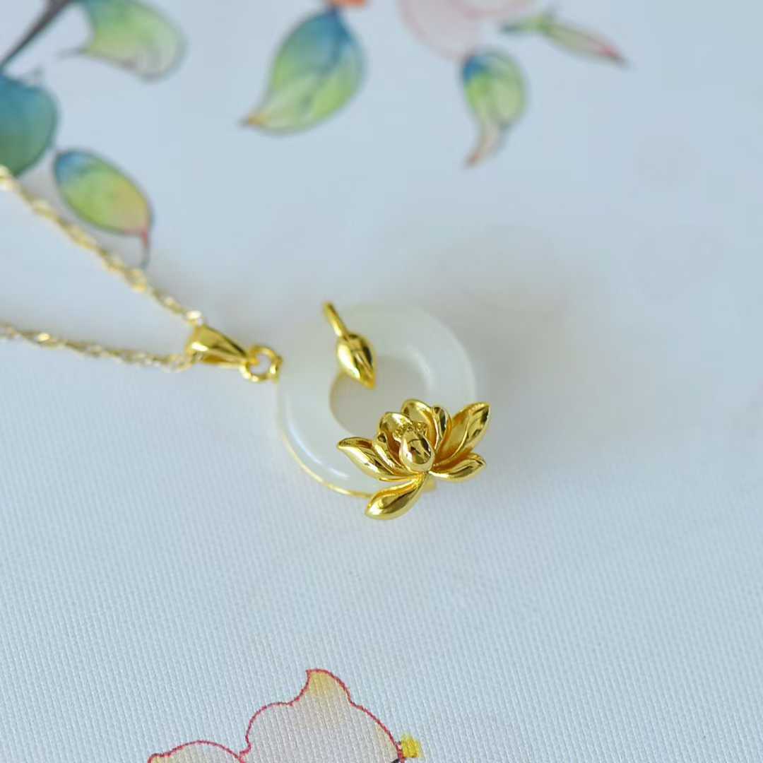 925 Silver Inlaid Hetian Nephrite Peace Ring & Lotus Pendant