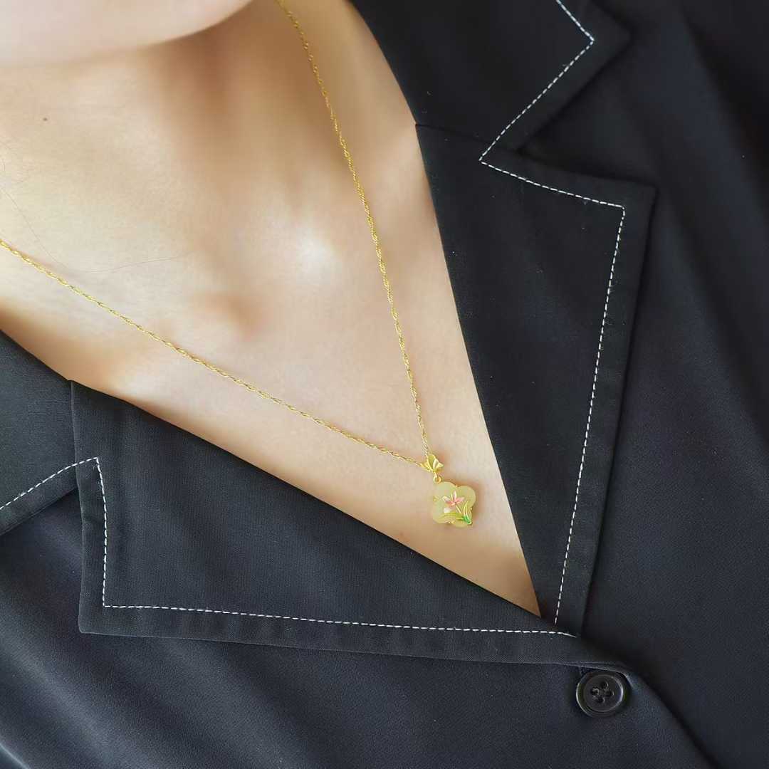 This elegant pendant blends exotic floral charm with universal luck symbolism, crafted from 925 sterling silver and inlaid with premium Hetian nephrite.Its design centers on two beloved motifs: Phalaenopsis (butterfly orchid, known for its graceful, butterfly-like blooms that symbolize elegance, refinement, and rare beauty) and Four-Leaf Clover (a global symbol of good luck, with each leaf representing hope, faith, love, and luck).