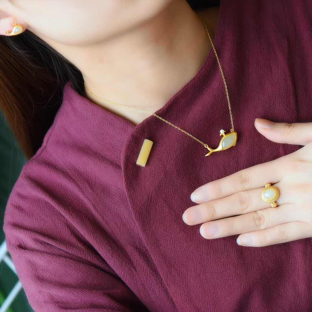 This pendant features a charming whale, crafted using ancient gold craftsmanship to create a golden whale silhouette. Its texture is both quaint and lustrous, exuding a sense of luxury. The jade inlaid is a soft, lustrous white, as delicate as the whale's "skin." The round pearl atop the pendant adds a playful touch, reminiscent of a small whale spouting pearly water.