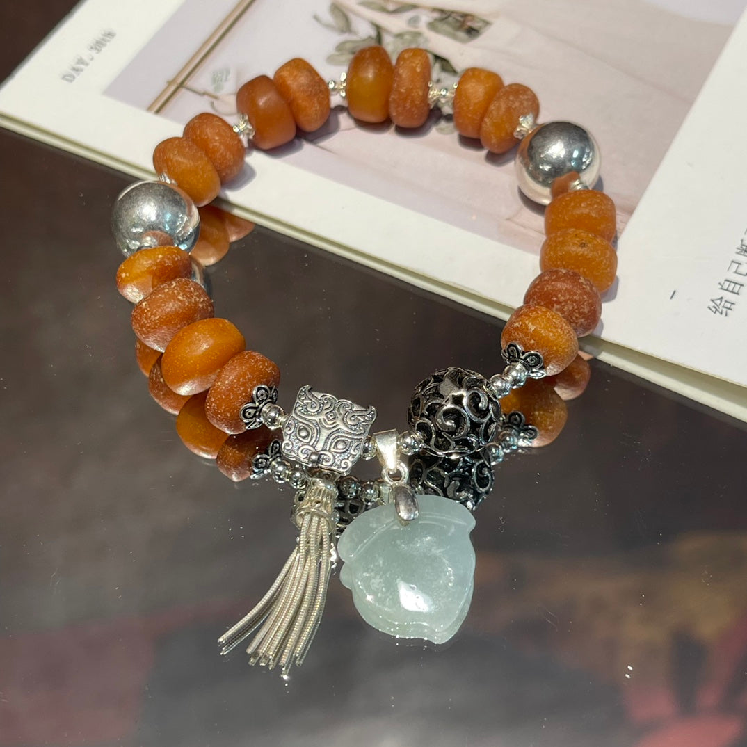 Product materials: amber cake + silver round beads + jade peach pendant + silver tassel