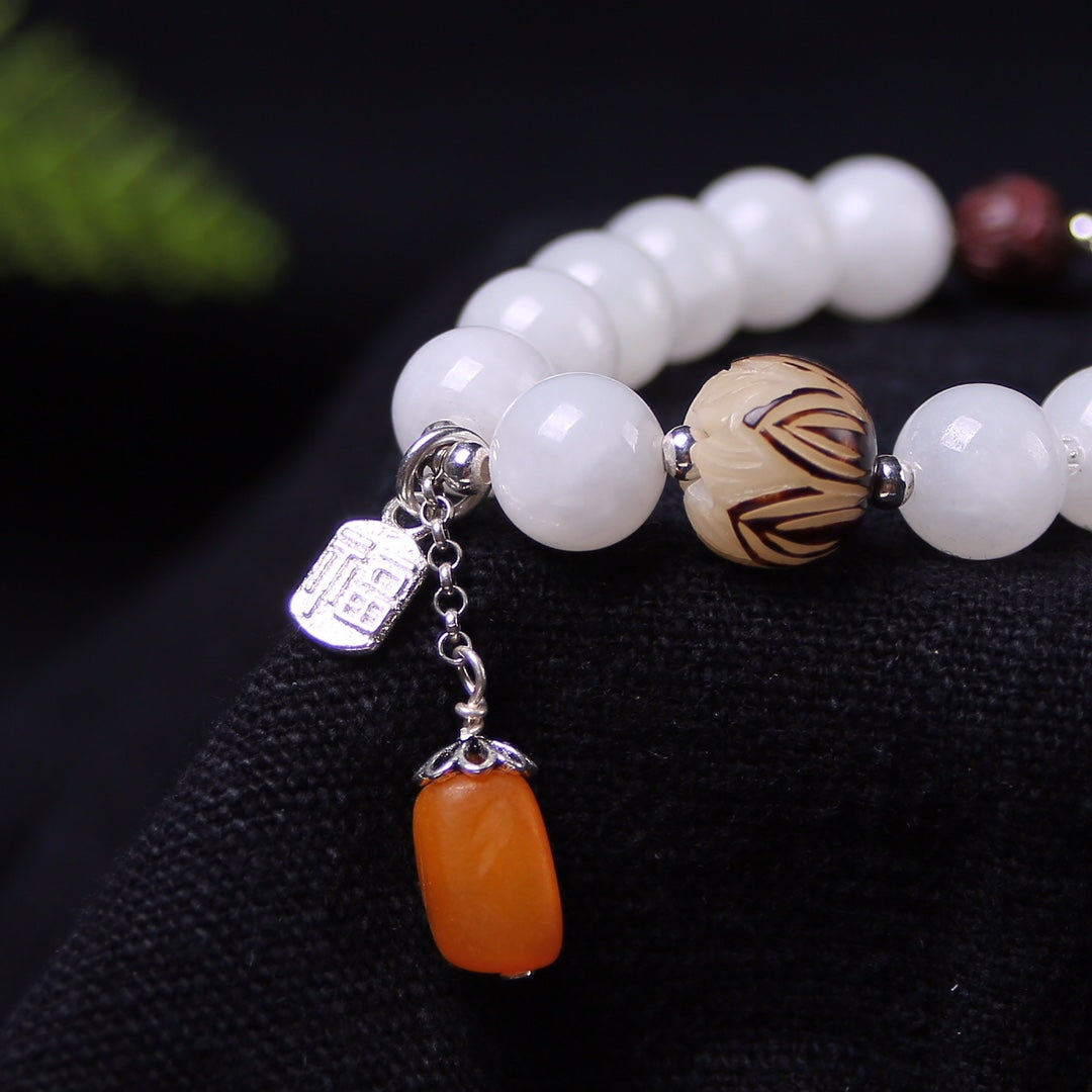 [Material]: Natural Hetian jade round beads ➕ old green jade beads ➕ Bodhi root lotus ➕ old beeswax ➕ S925 silver accessories