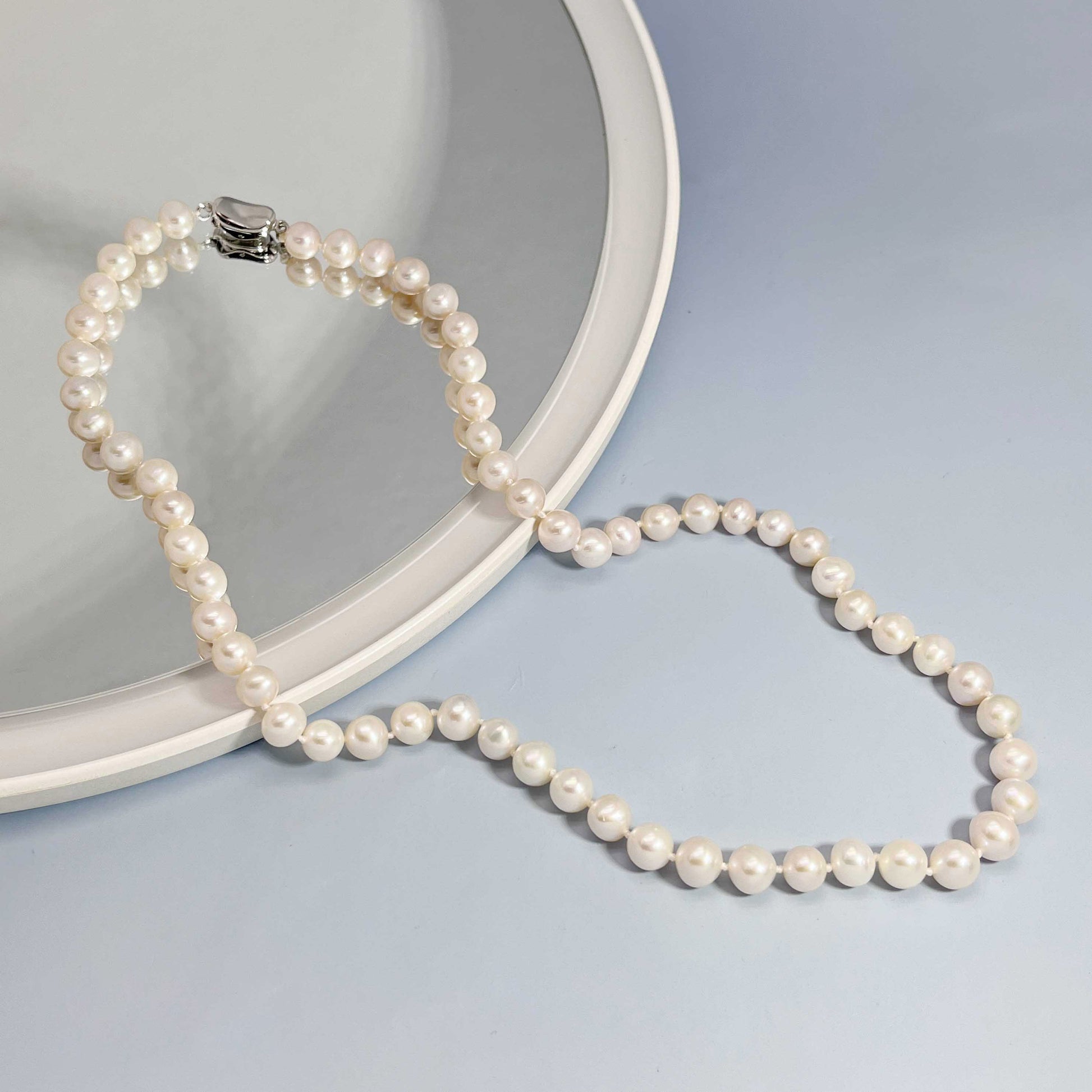 - 这条项链展示了有光泽的珍珠,似乎拥有内在的光芒。它们完美无瑕的表面和柔和的光泽营造出迷人的视觉诱惑,毫不费力地提升任何外观。这些珍珠是纯洁和美丽的象征,与一条纯银链优雅地交织在一起。纯银以其耐用性和时尚、抛光的外观而闻名,与珍珠相得益彰。珍珠温暖、有机的魅力与银色的凉爽、现代光泽之间形成鲜明对比,达到了完美的平衡。